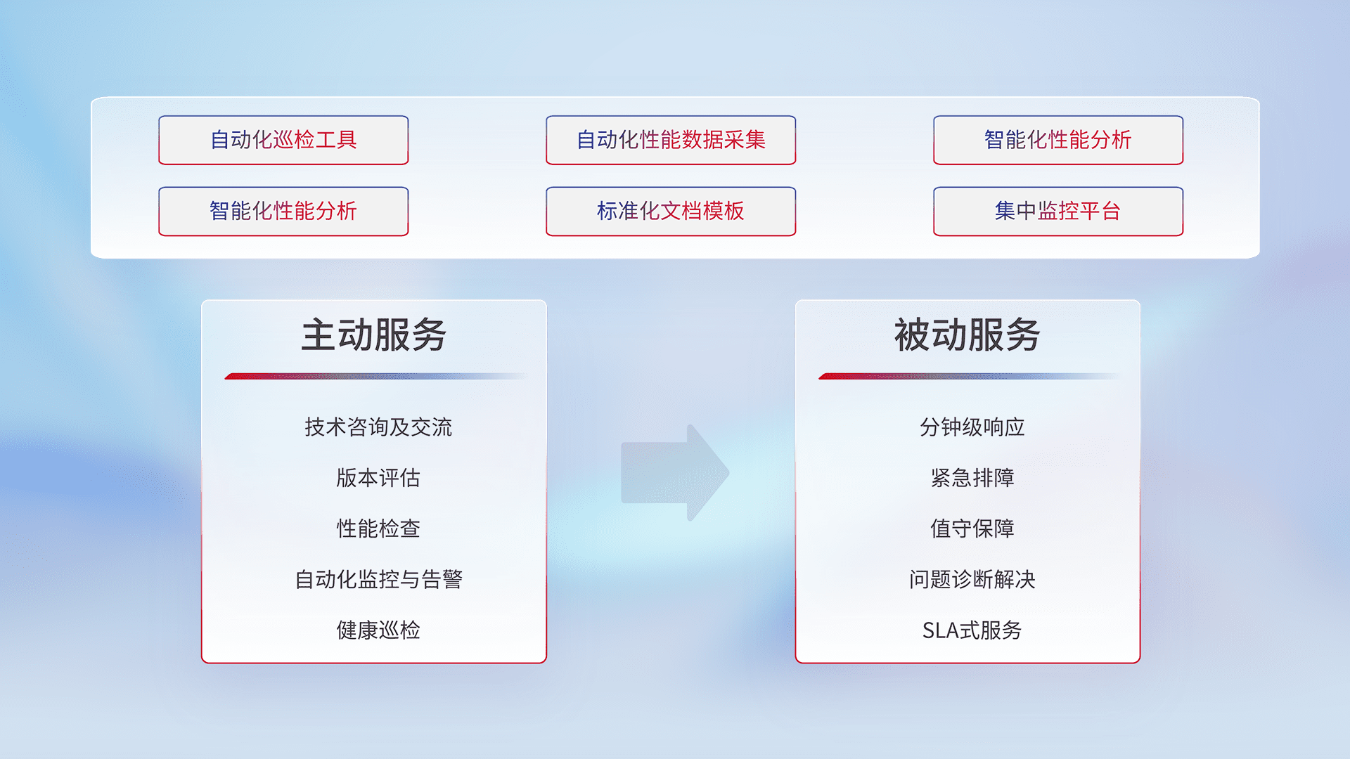 智能化工具和标准化文档,,,,保障服务质量,,,提供主动服务(包含技术咨询、、、、版本评估、、、性能检查、、自动化监控与告警、、、健康巡检)和被动服务包含(分钟级响应、、、紧急排障、、、、值守保障、、、问题诊断解决、、、SLA服务)。。。。